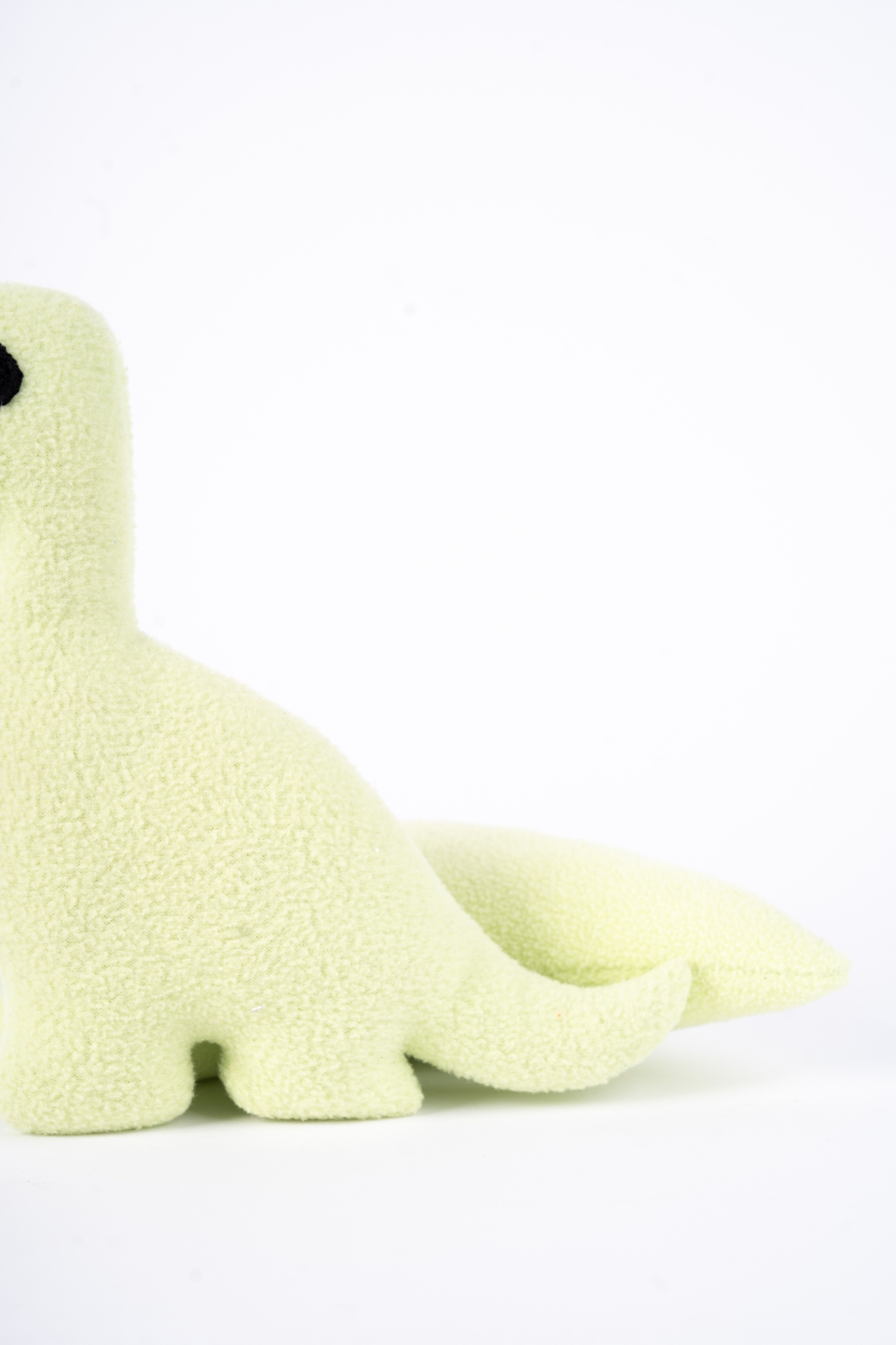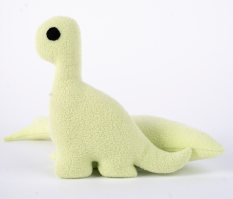 Brinquedo em forma de dinossauro feito com desperdício dos polares das fardas da LEROY MERLIN PORTUGAL. O enchimento também é 100% reciclado com desperdício dos têxteis das fardas!