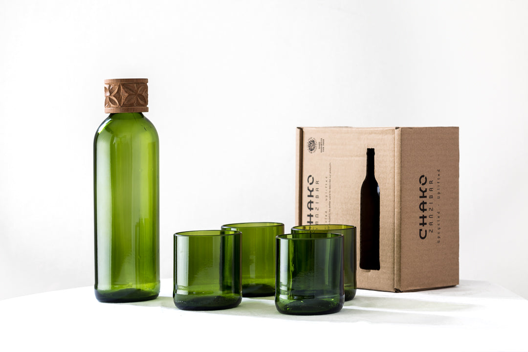 Perfeitos nas suas linhas simples e feitos através de vidro reciclado de garrafas de vinho, formam o conjunto ideal para utilizar na sua casa.