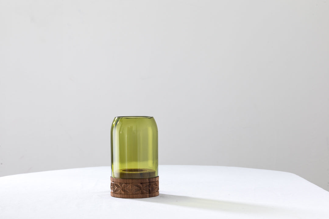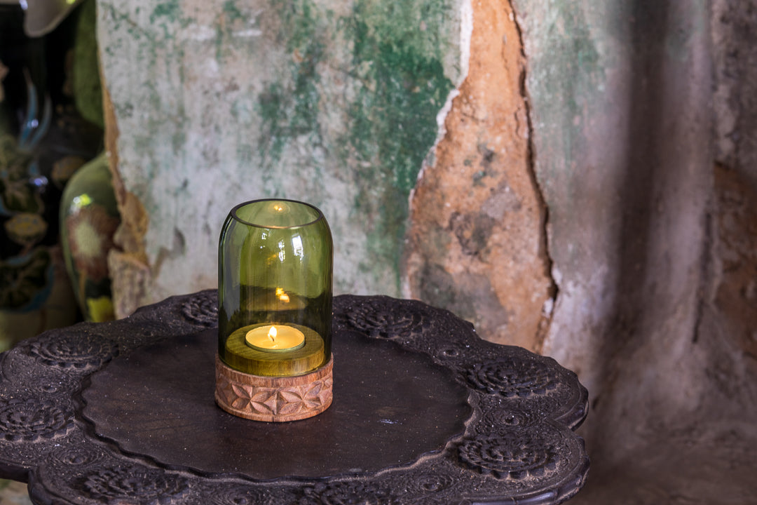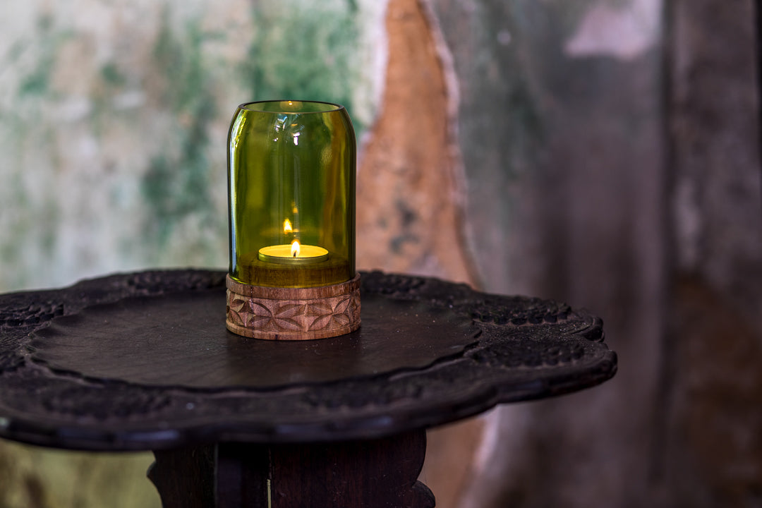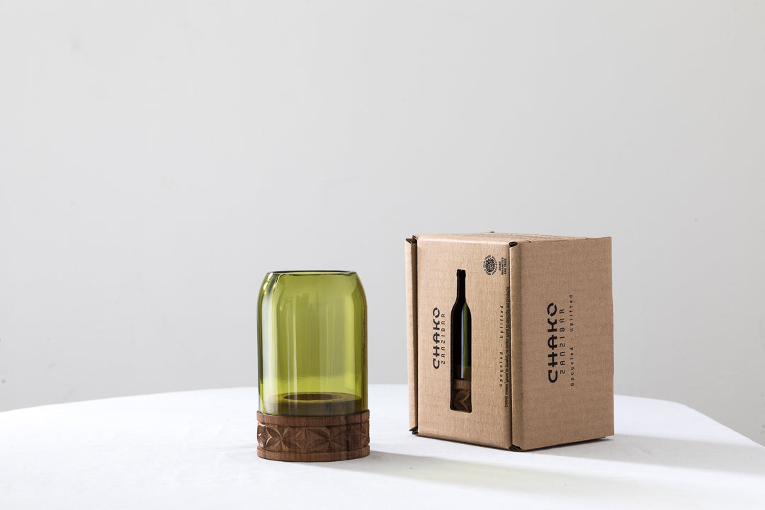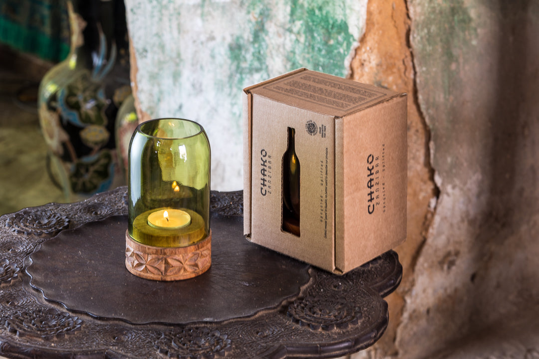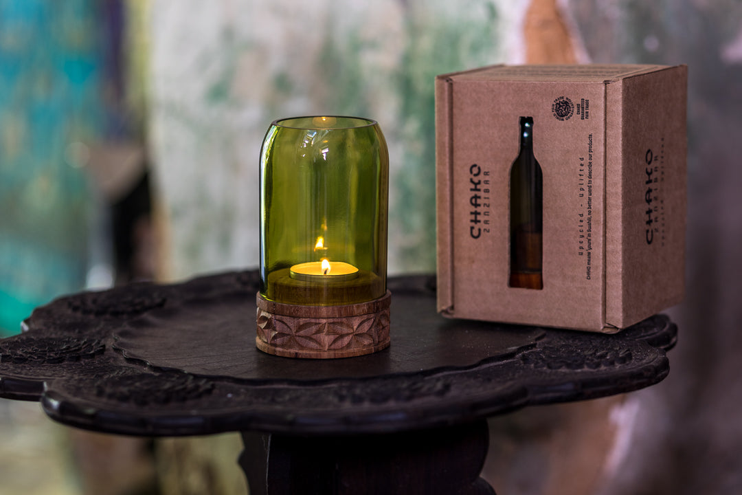 A vela é colocada neste castiçal especial, feito de garrafas de vinho recicladas, combinadas com madeira Mkongo na base, delicadamente trabalhada, irradiando luz e calor que tornam a nossa casa mais quente, agradável e aconchegante.